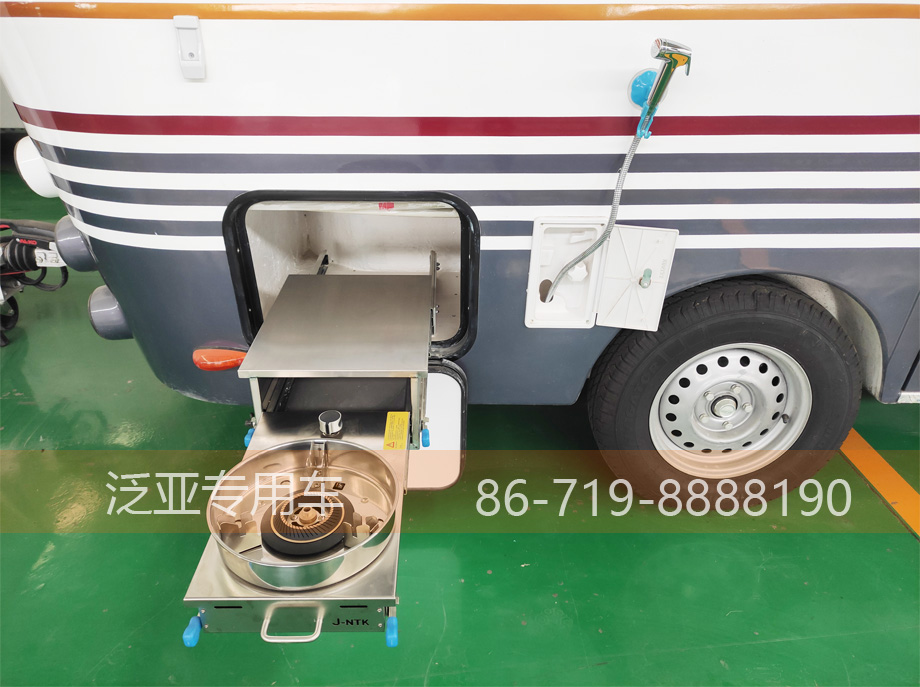 车顶装有4个示廓灯4个示宽灯,保证夜晚可以安全行驶。前方配有一个储物箱,内装有一台燃气热水器,其余空间可以用来储存些杂物,建议把液化气坛放在里面。储物箱两侧装有1套反光标、前卫灯和1个室电插座,是用来为房车充电的。车身装有2个500*400的小舱门,左侧舱门可以用来储存杂物,右侧舱门在选装户外厨房的情况下用来装抽拉式厨房,厨房下方我们准备好一根气管用来接前储物箱的气坛。厨房旁边是一个抽拉式的花洒,用来洗菜做饭用的,使用非常方便,即使在户外也能够轻松烹饪。