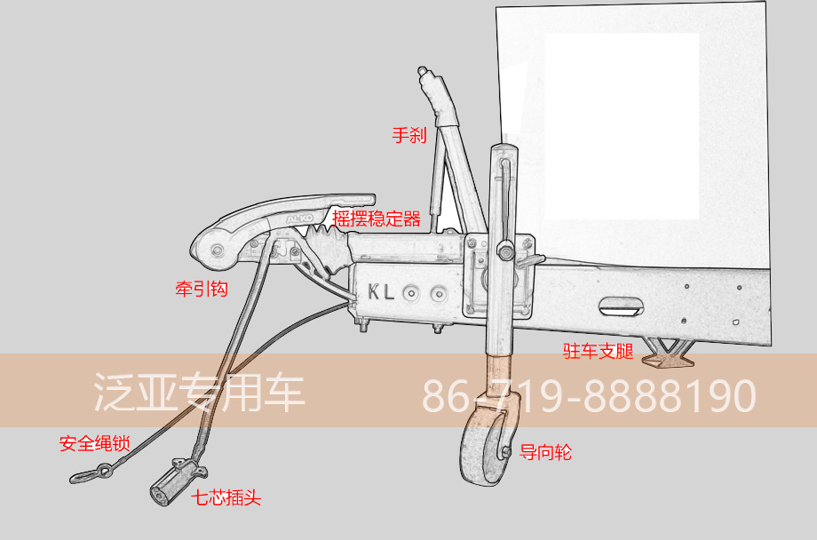 KL9010XLJ全车长5015mm宽2080mm高2500mm,属于C型拖挂房车,重量约900kg可谓非常轻便,平坦路面只需1.6T就可以牵引,山路行驶1.8T也就够了。房车最核心的位置便是底盘,KL房车采用德国爱科AI-KO进口刹车系统,进口的撞击式刹车使得在行驶过程中刹车丝毫感觉不到撞击,摇摆稳定器在转弯途中依然平稳,手刹再驻车时可以安心休息。导向轮是在非拖挂状态下掌握方向用的,在拖挂行驶过程中一定要收起来。安全绳是我们房车的又一道保险,请大家务必记得挂在前车上。七芯插是前车与房车信号灯的连接器,时前车与后车车灯同步。底盘车架由我公司自行研发设计而成,全程无焊接,避免长期使用中出现脱焊状况,四个支腿在上车休息时一定要放下,不要让轮胎单方面的长期受力。车架上“KL”字样就是我们对品质做出的担当。