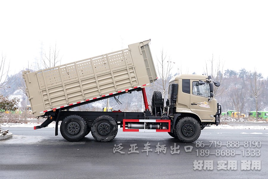 自卸车的车厢分后向倾翻和侧向倾翻两种,通过操纵系统控制 活塞杆 运动,后向倾翻较普遍,推动活塞杆使车厢倾翻,少数双向倾翻。