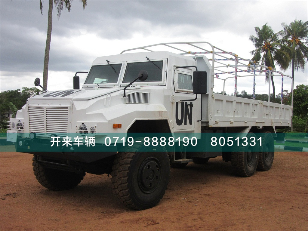 | 轮胎 | 越野专用轮胎14.00R20六只,带备胎一只;中、后桥为单胎;六只轮胎配有防弹内支撑体(选配);配有中央充放气功能(选配); |