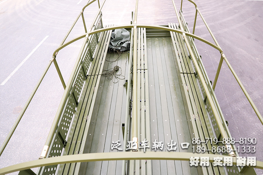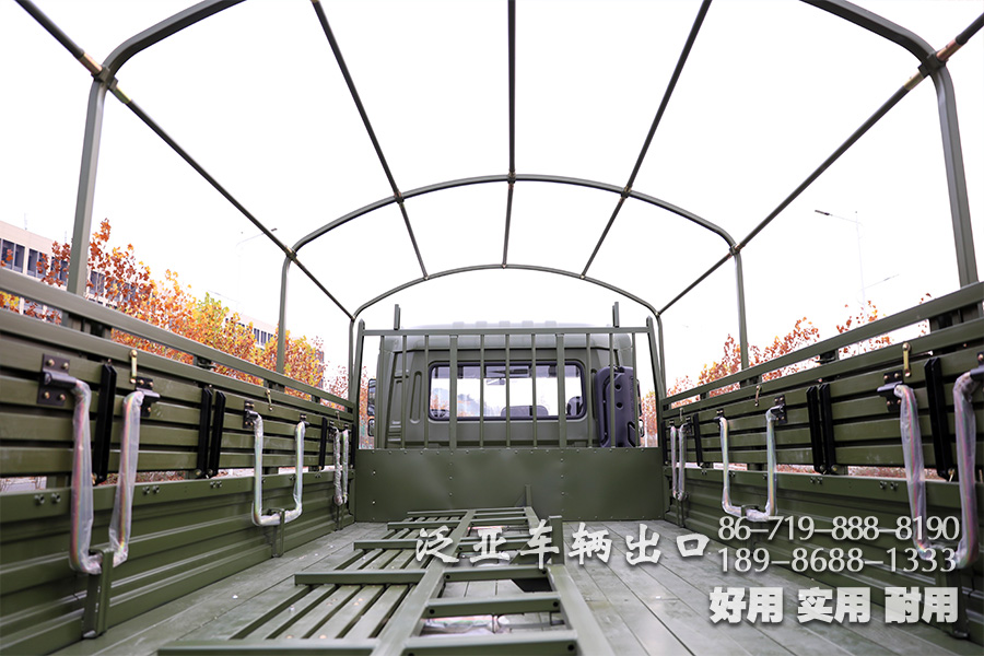 车上装有冷启动系统、副油箱、机油桶、水桶、篷布篷杆、工具箱等军用附加装置,可在-41℃环境温度下能顺利启动;可选装绞盘。