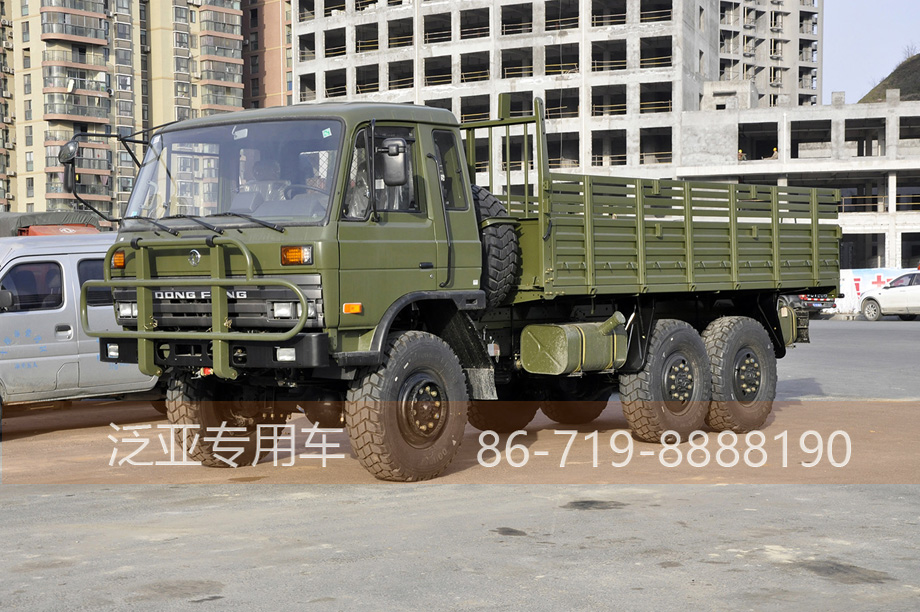 平头排半6×6越野汽车,康明斯170马力增压中冷柴油发动机,12.5R20加宽越野轮胎,6档机械式变速箱,前后桥驱动,防空灯,副油箱,机油桶、水桶,工具箱等军用附加设施,并带棚杆和蓬布,(可选装绞盘)
