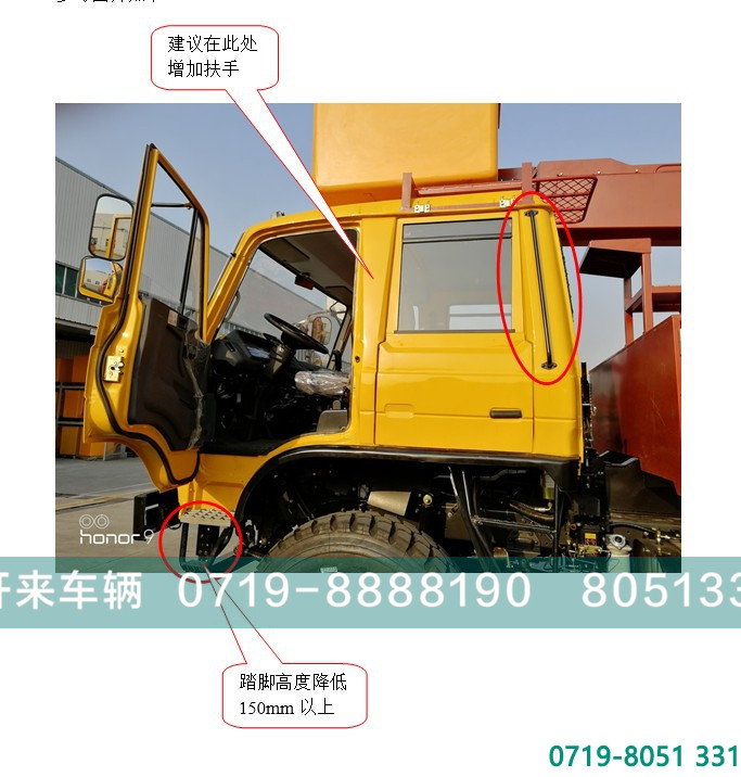 验收人员对底盘验收时也提出相同的问题,希望底盘厂家能对此问题做出整改,建议将踏脚向下延伸至少150mm以上,并且能在驾驶室前方增加扶手,参考图片如下:
