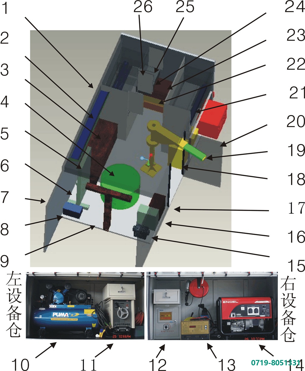 1.窗户 2 .行李仓 3.桌凳 4.大工件 5. 压力机 6.硬连接 7.后门 8.虎钳 9.拖举 10.空压机 11.电焊机 12.配电柜 13.充电机 14.发电机 15.砂轮机 16.台钻 17. 喷油试验器 18.饮水器 19.吊 20.右侧门 21.卷闸门 22.低位运输车 23.千斤顶 24.指挥箱 25.抽屉 26.工具柜